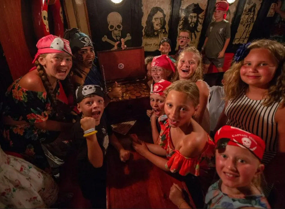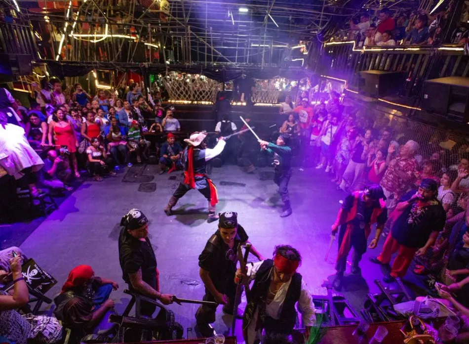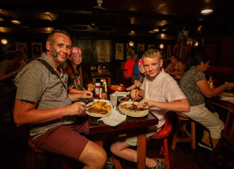 Conviértete en Pirata por una noche! Disfruta de nuestra cena-show abordo de los Galeones de Capitán Hook. Tu entrada incluye: Cena de tu elección, buffet de acompañamientos, barra libre nacional, concursos, música y mucha diversión para adultos y niños!